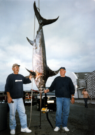 | Above, Australian Captain Hatch after landing one of his first Azorean swords.� This one looks to be about 150 lbs. - the size at which females mature.� (Photo, Jan van Gent) | ||||||||||||||||||||||||||||||||||||||||